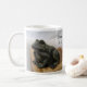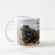 A cool frog sitting on a wicker basket accents this coffee mug. The message says 'green is in' this can be changed if so desired.