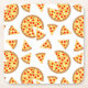 Cool and fun pizza slices pattern on white for birthday pizza party. Juicy vector made pizza with crunchy crust, cheese, salami, champignon mushrooms, olives and a sprinkle of oregano.
