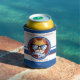 Can cooler featuring a funny cat with sunglasses on a striped background with cute cat paws on the bottom.
