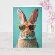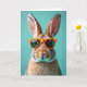 Designed with a close-up portrait of a furry rabbit facing forward, this card sets the scene against a smooth teal background 🌷. The rabbit’s layered fur mixes warm browns, creamy patches, and gentle gray tones, giving it a soft, cozy look. A pair of orange-framed sunglasses sits across its face, with dark reflective lenses that hide its eyes and add a flirty, “meet-me-later” kind of mystery 🐰. The contrast between the bright frames, natural fur, and cool backdrop feels like two friends sharing a private joke at a sunny spring gathering. Soft, diffused lighting traces the whiskers and rounded cheeks, making the fur texture stand out while the glasses keep a sleek shine. The greeting text sits near the top in a light color that pops against the teal, with a smaller line placed near the bottom in matching tones. The orange sunglasses frames are centered across the rabbit’s face, with glossy highlights along the rims and deep shadows in the lenses.