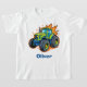 This personalized boys' t-shirt features a powerful green farm tractor with blue accents and large, rugged tires, set against an energetic, stylized background.