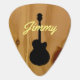 To complement the rustic look, the pick features a handwritten name in a pale yellow font style. This subtle touch adds a touch of vintage elegance, reminiscent of classic handwritten notes and sheet music. The gentle curvature of the letters harmonizes seamlessly with the overall design, creating a cohesive and artisanal aesthetic. Printed on the front and back too