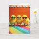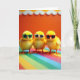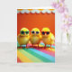 This greeting card shows three fluffy, golden-yellow baby birds facing forward against a rich orange background, leaning close like close friends in a shared joke 🌷. Each tiny bird wears small sunglasses that add a flirty, friendly twist—one pair in green, one in white, and one in red 🐇. Their soft feathers look gently lit, with even light catching the down around their cheeks and chests. Near the top edge, a blurry scalloped border in white with a hint of pale yellow frames the scene like a party trim. Across the lower portion, diagonal rainbow stripes run like a dance floor, pulling the trio together into one little group moment. There’s no large headline in the center, leaving the characters to do the talking, while any small message would sit best along the top margin in simple white lettering. The orange field stays smooth behind them, and the rainbow bands below show red, orange, yellow, green, and blue angled upward from left to right.
