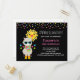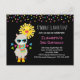Birthday party invitation postcard with a cool looking llama wearing some dark sunglasses. Dressed in a colorful striped scarf and fun little boots. A bright yellow sun with a happy kawaii face in the background. Whimsical colorful triangles surround this fun loving llama. Black background.