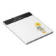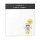 A notepad with a cool looking llama wearing some dark sunglasses. Dressed in a colorful striped scarf and fun little boots. A bright yellow sun with a happy kawaii face in the background. Whimsical colorful triangles surround this fun loving llama. Black background along the top border with your name personalized inside.