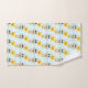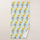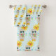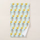 Towel set with a cool looking llama wearing some dark sunglasses. Dressed in a colorful striped scarf and fun little boots. A bright yellow sun with a happy kawaii face in the background. Whimsical colorful triangles surround this fun loving llama. Blue background.