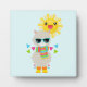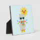 A photo plaque with a cool looking llama wearing some dark sunglasses. Dressed in a colorful striped scarf and fun little boots. A bright yellow sun with a happy kawaii face in the background. Whimsical colorful triangles surround this fun loving llama. Blue background.