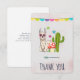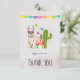 Party thank you card with a fancy bunting banner along the top. Illustrated with a cute llama wearing heart-shaped sunglasses. Some stars, a mushroom and a green cactus complete the illustration. Whimsical and cute.