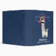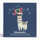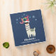 Personalized Christmas binder with a funny illustration. A cute llama wearing black sunglasses and a red santa hat. Also wearing a South American styled blanket and pom-poms. The word Joy written above his head in a festive colorful font. Blue snowflakes falling down.