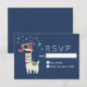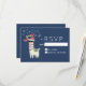 A Christmas RSVP card with a funny illustration. A cute llama wearing black sunglasses and a red santa hat. Also wearing a South American styled blanket and pom-poms. The word Joy written above his head in a festive colorful font. Blue snowflakes falling down. Set on a blue background. Whimsical and fun Christmas themed design.