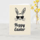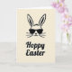 This greeting card features the head of a long-eared bunny drawn with thick black outlines on a creamy beige background, giving it a calm, modern look 🐰. The ears stand tall, with a tiny nose and a few simple whisker lines that feel like a gentle smile shared between friends. Dark rectangular sunglasses cover the eyes, adding a flirty, confident edge, like the bunny is sharing a private joke with someone close 🐇. The design sticks to just black and cream, so the shapes and contrast do all the talking without extra clutter. Centered beneath the bunny, the words “Hoppy Easter” appear in flowing black lettering that matches the weight of the outlines above. The text sits low on the front, leaving plenty of open space between the face and the message for an airy, relaxed balance. The bunny’s head is centered near the top half, with the sunglasses drawn as solid dark shapes and the whiskers radiating outward in short, even strokes.
