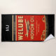 Cool retro beach towels for men in an automotive theme that represents a throwback to the olden days of the automobile industry with an oil can design.