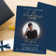 It's time to celebrate your graduation and invite your guests to a party with this modern photo invitation. On the front there is a minimalist design with a fake gold and white modern script and a customizable photo on a dark navy blue background. The back is with the same simple, stylish blue background. You can change the photo and the texts and make a personalized invitation.