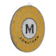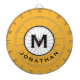Cool modern dart board in mustard yellow, black and white with monogram initial and name below. Personalize with name and initial.