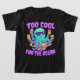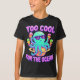A fun cartoon turquoise and pastel purple octopus wearing sunglasses floats on a Saturn-shaped pool float, holding colorful ice creams in every arm—strawberry, mango, and pistachio. Set against a watercolor-style blue ocean with neon highlights, gentle waves, and sun reflections. The bold hand-drawn “Too Cool for the Ocean” slogan adds playful charm, perfect for summer and beach lovers.