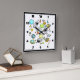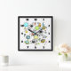 A clock with a cute and colorful pattern with all kinds of outer space themed elements. Images include astronauts floating around in their white space suits. Stars and planets and cool little rocket ships, spaceships, and satellites. Fun and crazy design.