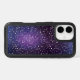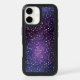 Cool outer space themed phone case features a vibrant blue and purple galaxy nebula background with a white overlay of stars and outlined constellations.