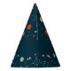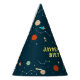 This fun outer space themed birthday party hat design is mostly of navy blue color scheme
