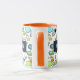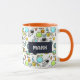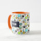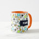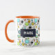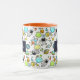 Personalized coffee mug with a cute and colorful pattern with all kinds of outer space themed elements. Images include astronauts floating around in their white space suits. Stars and planets and cool little rocket ships, spaceships, and satellites. Fun and crazy design. Perfect for space-loving scientists.