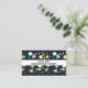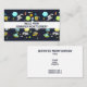 A business card with a cute and colorful pattern with all kinds of outer space themed elements. Images include astronauts floating around in their white space suits. Stars and planets and cool little rocket ships, spaceships, and satellites. Fun and crazy design.