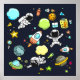 A poster with a cute and colorful pattern with all kinds of outer space themed elements. Images include astronauts floating around in their white space suits. Stars and planets and cool little rocket ships, spaceships, and satellites. Fun and crazy design.