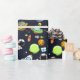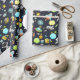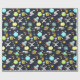 Patterned wrapping paper with a cute and colorful pattern with all kinds of outer space themed elements. Images include astronauts floating around in their white space suits. Stars and planets and cool little rocket ships, spaceships, and satellites. Fun and crazy design.