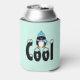 This can cooler has a cute penguin dressed in a blue and white striped scarf and a blue hat with snowflakes on it. Below is the word "Cool" in black letters. Background is a light aqua-blue color. Customize to change text and background colors if desired.