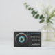 © Sunny Mars Designs. Blue Eye Camera Lens Photographer Business Cards - Cool, unique, mod black and blue photographer business card with camera lens of a blue iris eye as the diaphragm shutter. This modern, stylish card template is fully customizable.