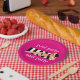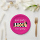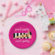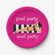 Coolest pool or beach party plates with text you can customize online along with ability to customize the pink background color. Designed for a social gathering at home, girls night out, or birthday party.