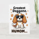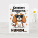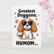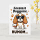 This card features a spaniel-like dog with long russet-and-white ears sitting calmly on a white background, facing forward with a cool, affectionate attitude ❤️. Dark sunglasses cover its eyes, giving it a slightly mysterious look that still feels friendly, like a pet posing proudly for someone it adores. Around its neck is an orange-and-black animal-print collar that adds a fun, stylish touch. A big message appears in thick uppercase lettering, with black and orange text placed above and below the dog, reading “Greatest Doggone HUMOM...”. Small orange paw prints are scattered around the design, like little traces of companionship and inside jokes between a pet and its favorite person 🌼. The simple shading and crisp outlines keep the illustration graphic and easy to read while letting the dog’s pose do most of the talking. The paw prints sit mostly near the wording, dotting the open white space around the central figure.