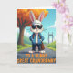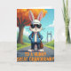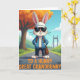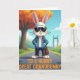 Designed with a friendly, human-like rabbit standing center on a quiet open road, this card shows long ears with soft pink inner fur and a small smile that feels like it’s meant for someone special 🐇. Dark sunglasses and a bright white cap give the character a relaxed confidence, like it’s waiting for a favorite friend to catch up. It wears a cool blue zip jacket over a pale top with dark trousers, and a brown shoulder bag hangs across its side while its hands rest in the pockets. To the left, a large tree spreads orange and golden leaves, adding a cozy glow that pairs nicely with the rabbit’s calm pose 🌷. A wide blue sky stretches overhead with a few thin clouds drifting by, keeping the scene airy and open. Along the lower front, bold orange lettering sits prominently against the road and grass, easy to spot at a glance. The gray road narrows into the distance between green edges, leading toward a faint bridge shape on the horizon.