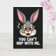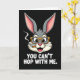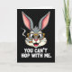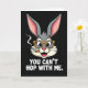 Designed with a high-contrast digital illustration style, this card features an upright, humanlike hare set against a deep black background 🐇. The hare’s head sits near the top of the layout, with tall ears, a wide grin, and a steady gaze that feels like a teasing challenge shared between close friends. Bright orange, thick-rimmed glasses frame its eyes, adding a clever, modern touch to the character. A cigar rests at the corner of its mouth, and a thin curl of white smoke rises upward, giving the scene a sly, rebellious edge. Warm grays and soft pink accents shape the fur and highlights, while orange details pop sharply against the dark space 🌷. Centered near the bottom, the phrase “YOU CAN’T HOP WITH ME” appears in white, all-cap letters that stand out clearly. The smoke trail arcs toward the upper right, fading as it climbs into the black.