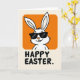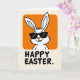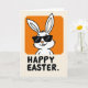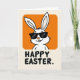 This card features a white, long-eared bunny character 🐰 shown from the head and upper chest, centered near the top as if leaning in for a friendly hello. The bunny sits inside a rounded rectangle of warm orange, creating a cozy spotlight that feels like an inviting little stage. Dark, angular glasses cover its eyes, adding a cool, slightly teasing look, while a small curved smile and two front teeth suggest a sweet, flirty confidence. The background is a creamy off-white, keeping the scene airy and letting the orange, white, and black colors stand out with strong contrast. Beneath the illustration, a seasonal greeting appears in sturdy black letters, set in a simple sans-serif style and aligned to read clearly at a glance 🌷. The overall layout feels balanced, with the big orange shape above and the grounded text below, like a quiet conversation between image and words. The bunny’s ears rise upward within the orange frame, and the black lettering sits centered along the lower portion against the pale background.