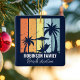 Personalized navy blue beach Christmas ornament keepsake for your family trip to Hawaii, Florida, or other tropical island destinations. Cool palm trees sway against retro colors of orange and yellow above your customized vacation name in white script. Matching gifts are great for a group going on a cruise or coastal getaway.