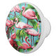 Nostalgic and cool design in bright graphic colors featuring pink flamingos and green palm trees against a deep sky blue background.