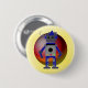 A cool royal blue and gray robot in front of a red and yellow shaded sphere. A shaded yellow background accents it.