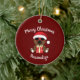 PLdesign Cool adorable Brown Bear with Santa hat, red sunglasses and beautiful red Christmas gift box with gold ribbon and snow flakes in his lap. Christmas ornament with custom text: your name and Merry Christmas.