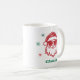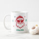 Coffee mug featuring a cool Santa wearing sunglasses and your custom name in a fun, retro font. Red and green shades. Colors can be customized in the design tool.