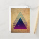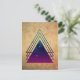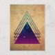 A cool sci-fi illustration with a grunge background. The background is an aged grungy antique brown color. The illustration is composed of a big triangle filled with blue and purple outer space imagery and texture. This triangle is surrounded by several blueish purple triangle outlines which stack upward.