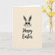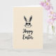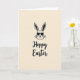 This card features a minimalist line drawing of a springtime bunny head centered on a soft, pale background 🐰. Long ears rise upward, and a small nose and gentle smile give the face a friendly, almost flirty look, as if it’s sharing a quiet joke with someone close. Dark, sleek glasses sit across the eyes, adding a modern twist that feels like a confident friend showing up dressed for brunch 🌷. Beneath the illustration, a short seasonal greeting appears centered near the bottom in flowing cursive-style lettering. The text is printed in the same deep, dark tone as the outline, keeping the layout unified and easy to read. The limited color palette relies on strong contrast, with crisp dark lines standing out against the warm, muted base. The bunny’s glasses are filled in solid dark, while the rest of the face remains an open outline with plenty of airy space around it.