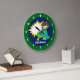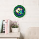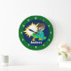 Custom superhero kids room wall clock personalized with your child's name. An awesome super kid in a blue and green costume.