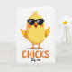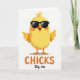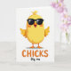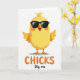 This card features a bright yellow baby bird centered on a white background, standing with rounded wings stretched wide as if inviting a hug from a close friend. Dark, sleek glasses sit across its face, giving it a flirty, confident look that contrasts with its soft, cuddly shape. Its beak is open in a laugh, showing a small red interior, while gentle orange blush marks on its cheeks suggest it’s reacting to someone it likes. Subtle shading adds depth to the simple illustration, keeping the focus on the character’s sunny color and friendly pose. Below the bird, the word “CHICKS” appears in large orange letters near the bottom center, easy to spot at a glance. Just under that, “Dig me” is written smaller in orange, like a quick note meant for someone special, and a tiny 🌷 or 🐰 would feel right at home nearby. The glasses are deep charcoal, the blush is soft orange, and the open beak shows a red accent against the smooth yellow body.