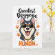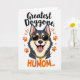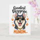 This greeting card features a cheerful, stylized dog’s head in dark gray and cream, drawn with a sturdy, working-breed look and an open-mouthed grin with a pink tongue that feels like a friendly hello ❤️. The dog wears leopard-pattern sunglasses with dark lenses, giving it a cool, affectionate “we’re in this together” attitude, like a loyal buddy posing for a photo. Around its neck sits a gold-toned chain collar with a small bell-like charm that suggests it’s well loved and happily cared for. The background stays bright white, letting the character stand out while orange paw prints and short radiating dash marks surround it like little bursts of excitement. Near the top, the phrase “Greatest Doggone.” appears in black lettering, centered above the dog’s ears. Near the bottom, “HUMOM...” is set in large orange capital letters, spaced to feel like a shout-out to someone special 🌼. Orange paw prints dot the corners and sides, with dash lines fanning outward around the dog’s face.