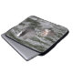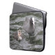 This awesome laptop sleeve features a photograph of a Coot and her chick swimming on a tidal river. The female is gray with a white patch on her head and red eyes, while the tiny fluffy chick is pale gray with a white front.
