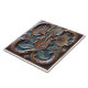 A square tile with a raised floral design, the tile has a dark blue-gray background, and the raised design is in shades of bronze and green, the design features three large leaves at the top, with smaller leaves and swirls around them, the leaves have a ribbed texture, and the swirls have a smooth, flowing appearance.