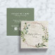 A beautiful square business card featuring watercolor eucalyptus greenery decorating a faux copper foil geometric wreath, set against a faux birch bark background, and personalized in the middle with your name and job title in a combination of trendy handlettered and sans serif typography. The back of the card displays all your contact information, in white text on a coordinating green background. The typography has been carefully designed to be easy to read. This business card will be perfect for florists, event planners, designers, landscape artists, Wedding Coordinator, spa salon, and more. Copyright Elegant Invites, all rights reserved