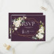 Modern and trendy, this wedding invitation RSVP design features a faux copper geometric embellished with watercolor white floral and eucalyptus greenery floral arrangements, over a modern plum background. This is the no meal option. Part of a matching wedding set. Copyright Elegant Invites. All rights reserved.