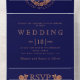 Copper glitter rose wreath on navy blue wedding all in one invitation