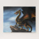 A majestic dragon with copper, gold and black scales on a cliff edge with blue skies in behind.