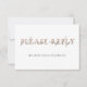 A beautiful, modern typography wedding invitation RSVP card in this season's latest trend: copper! This beautiful black and white invitation features the words 'please reply' in a combination of fonts: a modern, all cap serif font rendered in a gorgeous copper texture, overwritten with the words 'please reply' in a modern, hand lettered black script type. The result is fresh, modern, and unique! Personalize your details on the reverse, featuring a beautiful fine art paper texture. This easy to personalize design is part of a larger Invitation Suite, so be sure to visit my Zazzle store to check the suite, if you like this design. Copyright Anastasia, Lady of Lochaber and Glencoe 2019, All rights reserved.